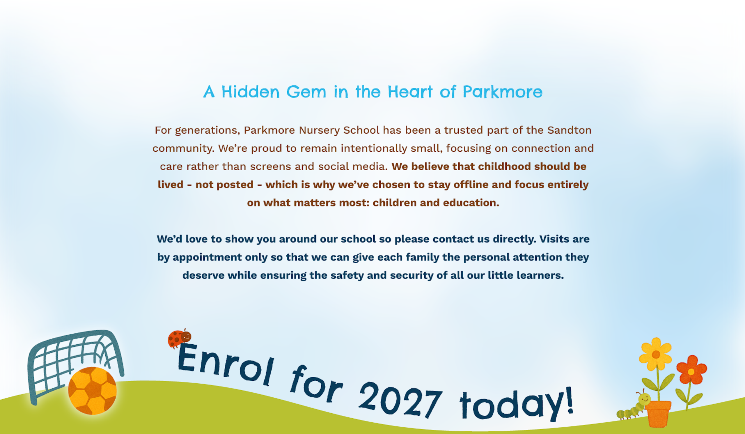 For over 60 years, Parkmore Nursery School has offered a safe, nurturing, and joyful environment where childhood is celebrated and learning unfolds naturally through play, music, movement, and stories — the way it should.